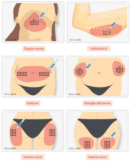 Il prodotto viene iniettato con un ago sottile direttamente nel tessuto adiposo. La procedura viene eseguita in regime ambulatoriale, senza anestesia, è indolore e si possono riprendere immediatamente le normali attività. Sono necessarie più sedute di trattamento a distanza di due settimane l’una dall’altra per raggiungere i risultati desiderati e il numero di sedute varia a seconda delle aree da trattare e delle condizioni di partenza. Il prodotto è biodegradabile e lentamente riassorbito nel tempo.